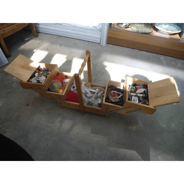 Portacucito in legno con vario materiale da utilizzo come cerniere, aghi, filati ecc. Vendiamo tutto in blocco a 50 euro!.
