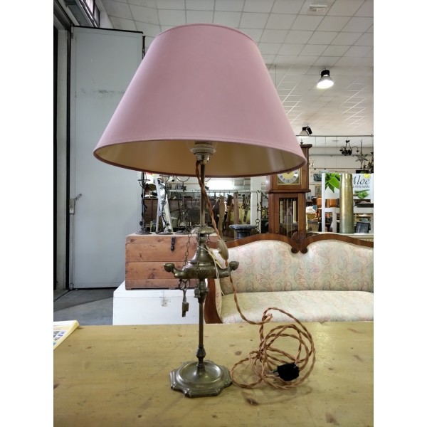 Particolare lampada con paralume, ottenuta da una lucerna fiorentina antica ad olio. La parte elettrica è perfettamente funzionante.
