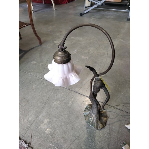 Particolare lampada da tavolo in bronzo patinato in stile Art-Nouveau, raffigurante una donna sirena, e fusto ad arco che termina con un punto luce in vetro rosa. In buone condizioni.