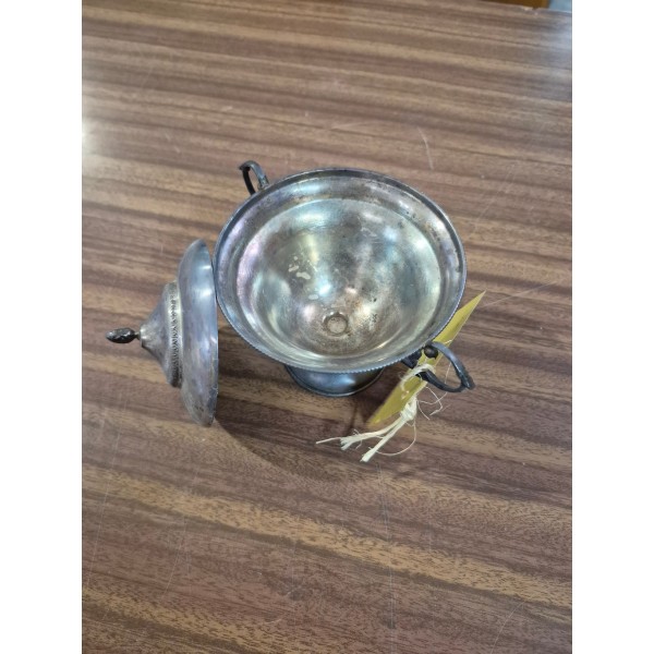 Zuccheriera in argento 800, con coperchio la cui presa è a forma di pigna e manici a voluta.